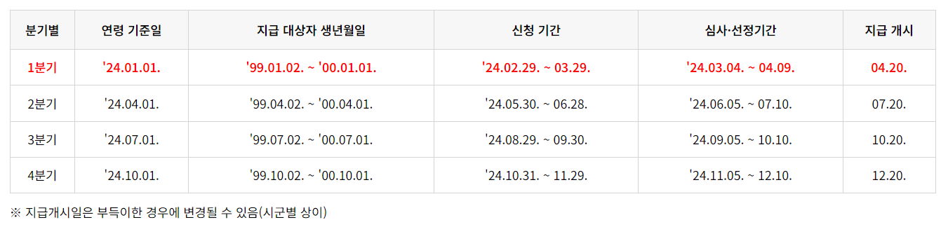 2024년 분기 별로 신청기간과 지급일정은 다음과 같습니다.
